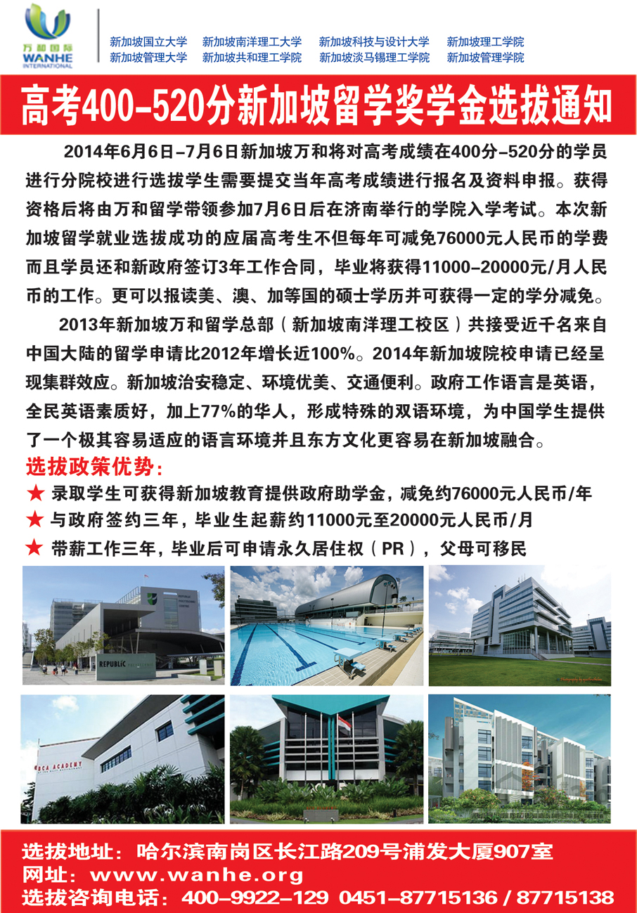 新加坡管理学院(SIM) 高中毕业直接入学专本连读 新加坡万和留学黑龙江和山东公司本年度共接收80多名来自黑龙江和山东省内各地的新加坡管理学院申请。本次10月份入学的SIM 即将截止申报。请广大学生及家长及时准备相关材料。 新加坡管理学院成立于1964年,学院承担了培训国内管理人才和协助企业经营技巧专业化的任务,以配合新加坡经济的发展。自成立以来,管理学院一直致力于和世界名校合作的方向前进。如今,新加坡管理学院不但和英国伦敦大学、伯明翰大学、谢菲尔德大学、皇家...